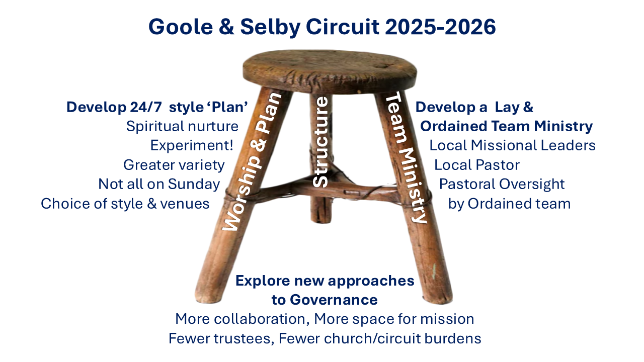 Many Circuits and Districts around the Methodist Connexion are exploring new ways of approaching how their areas 'function', and how governance can be done well, but in a way that is proportionate to the size and needs of their organisation. Key to this is releasing church to be church without focus of time and effort being primarily absorbed by 'running the organisation'. Some Districts have amalgamated, as have Circuits - recognising that this a way to streamline governance processes and the number of people needed as trustees. The Yorkshire North and East District has gone a slightly different route; by establishing a new Circuit (Bridge) whose role is primarily to be a governance body within which local methodist areas (circuits) can operate. Basically, this Circuit oversees, manages, and provides governance so that those who join the Circuit are freed to focus on their local mission. If Goole & Selby chose to join into this approach, rather than being a circuit/charity in our own right, we would be a Mission Area of the Bridge Circuit.